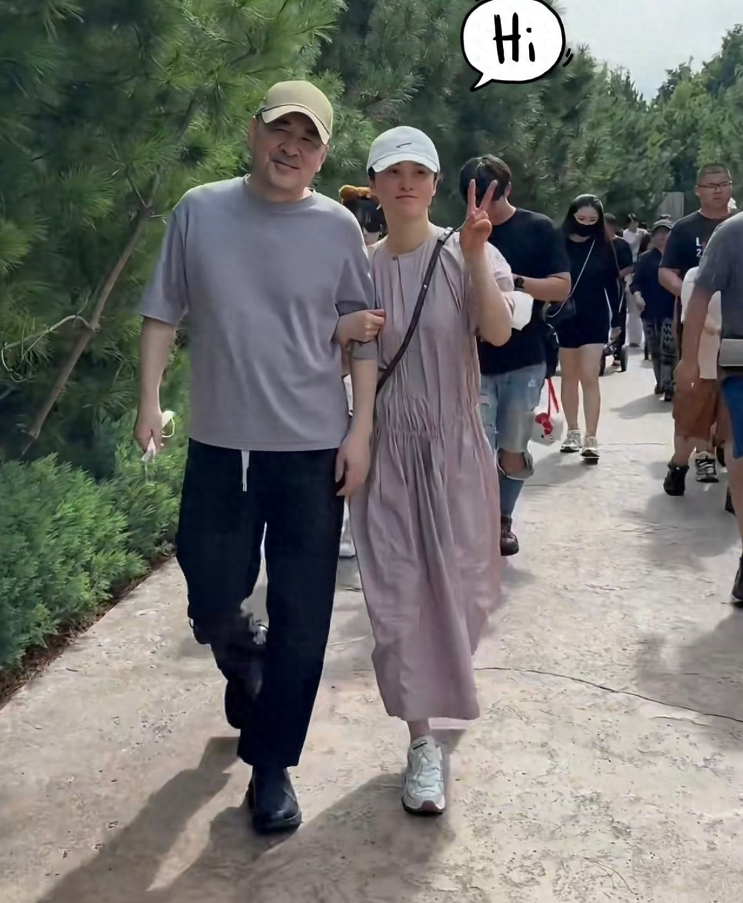 反观陈建斌,那就更随意了,灰色的短袖,黑色裤子黑色的鞋,帽子是卡其色的,从裤子上的那条白色束腰带就能看出,陈建斌在穿着上从不讲究,毕竟有孩子有老婆了,一切都可以舒服地生活了。